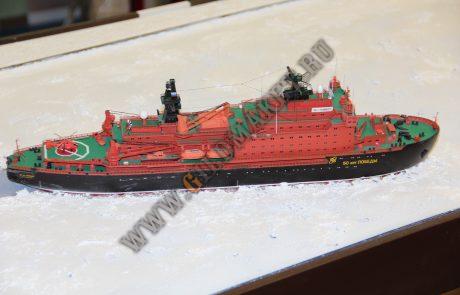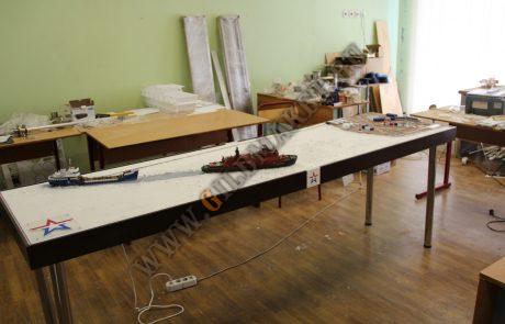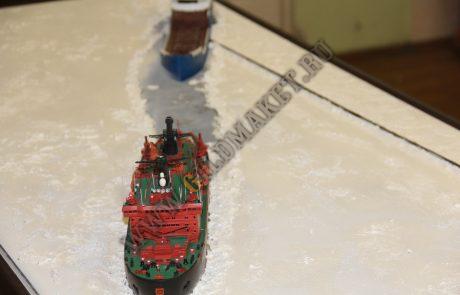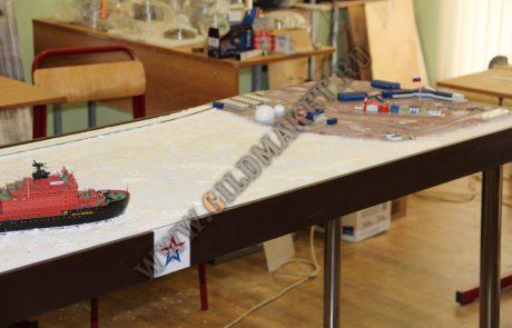 Макет демонстрирует прокладку пути ледоколом через Северный морской путь для прохода танкера и последующей перевалки ГСМ в хранилища островной базы.