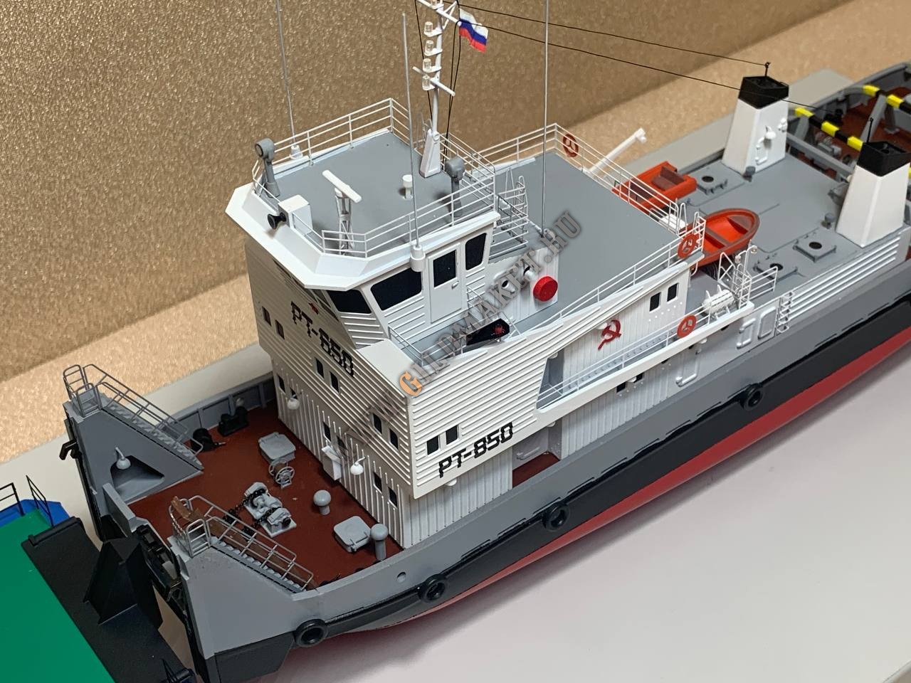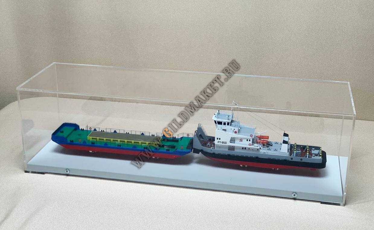 Задача: Создать выставочную модель речного состава, состоящего из буксира-толкача типа РТ-850 и сухогрузной баржи, с высокой степенью достоверности передающую конструктивные особенности прототипа.