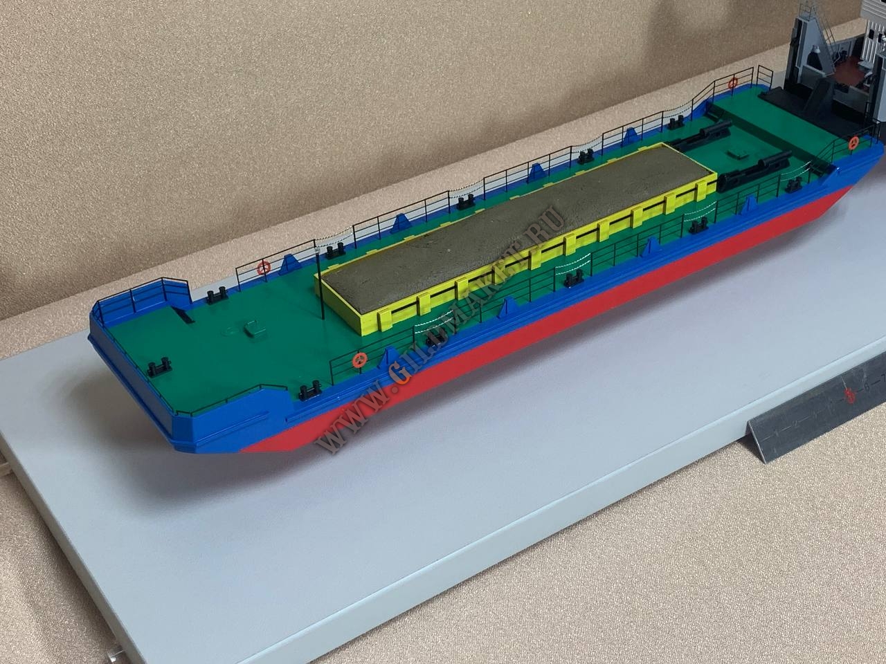 Особое внимание уделено проработке «рабочих зон»: палубных механизмов, спасательных шлюпок, радиолокационного оборудования и груза на барже. Модель предназначена для экспонирования в музеях, офисах транспортных компаний или частных коллекциях.