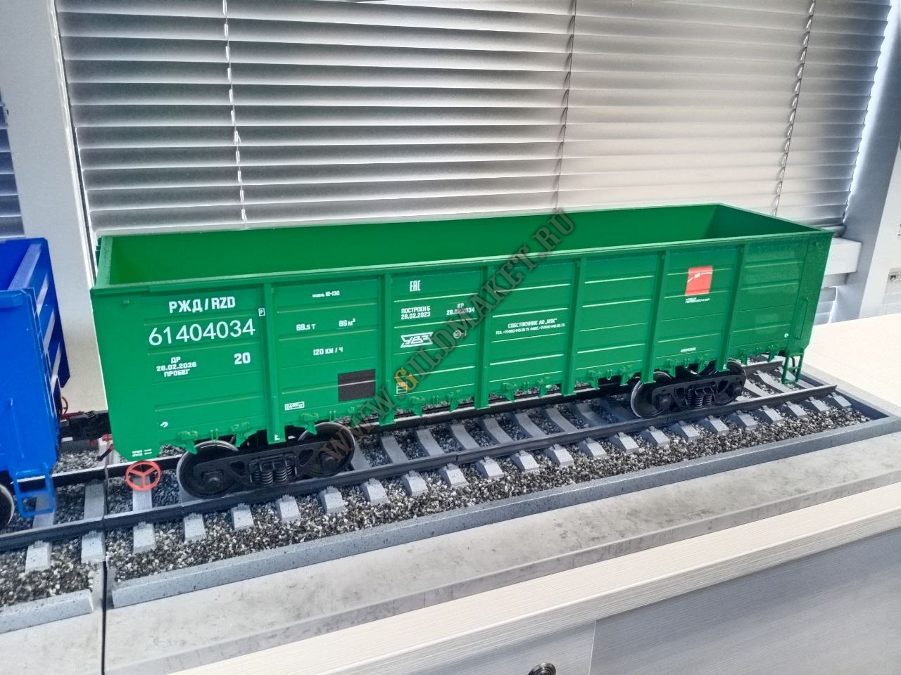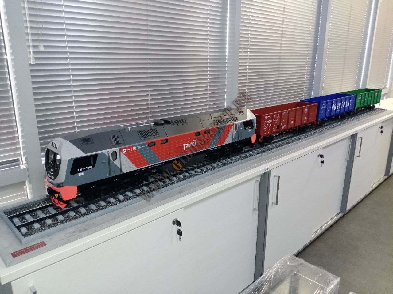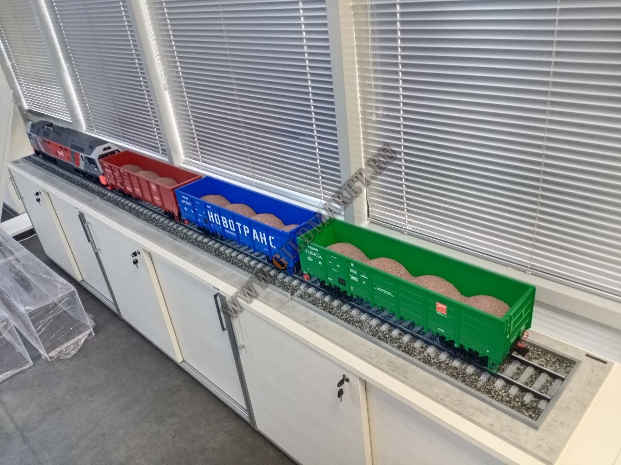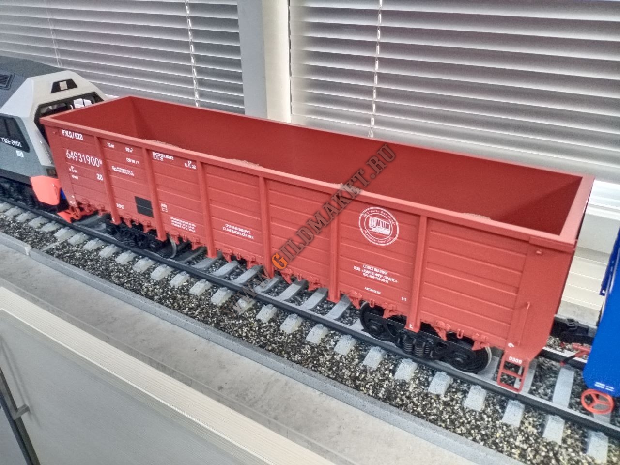 Особенности: Полная имитация железнодорожного полотна с щебёночным балластом, высокая степень детализации экстерьера, нанесение фирменной символики заказчиков методом тампопечати и аппликации.