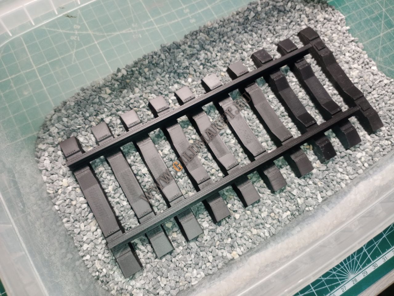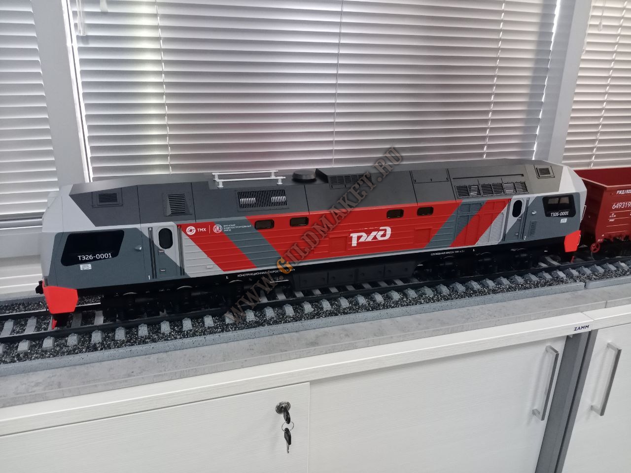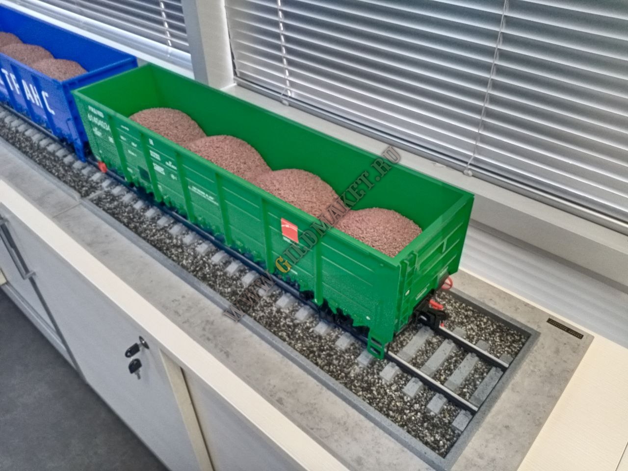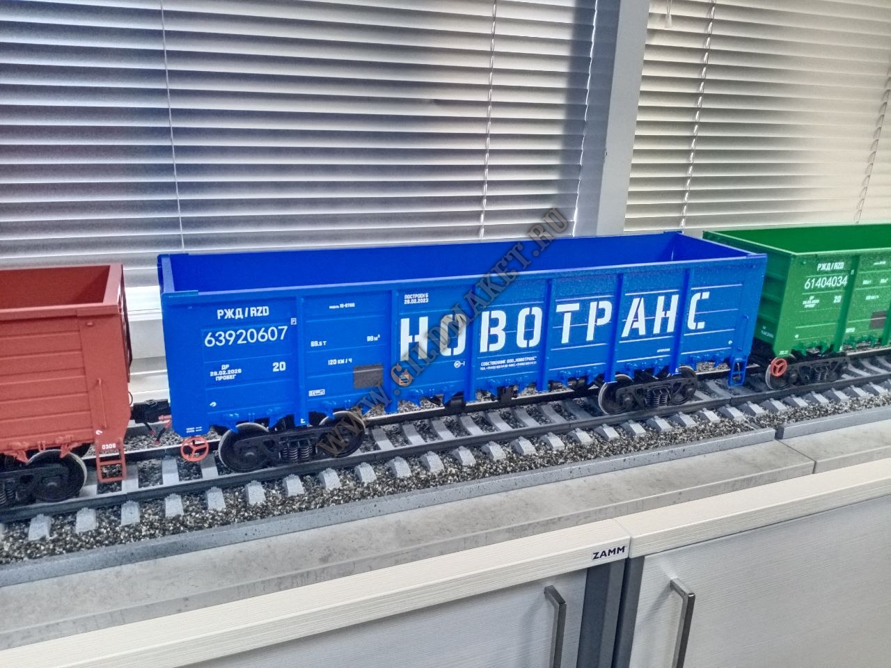 Особенности: Полная имитация железнодорожного полотна с щебёночным балластом, высокая степень детализации экстерьера, нанесение фирменной символики заказчиков методом тампопечати и аппликации.
