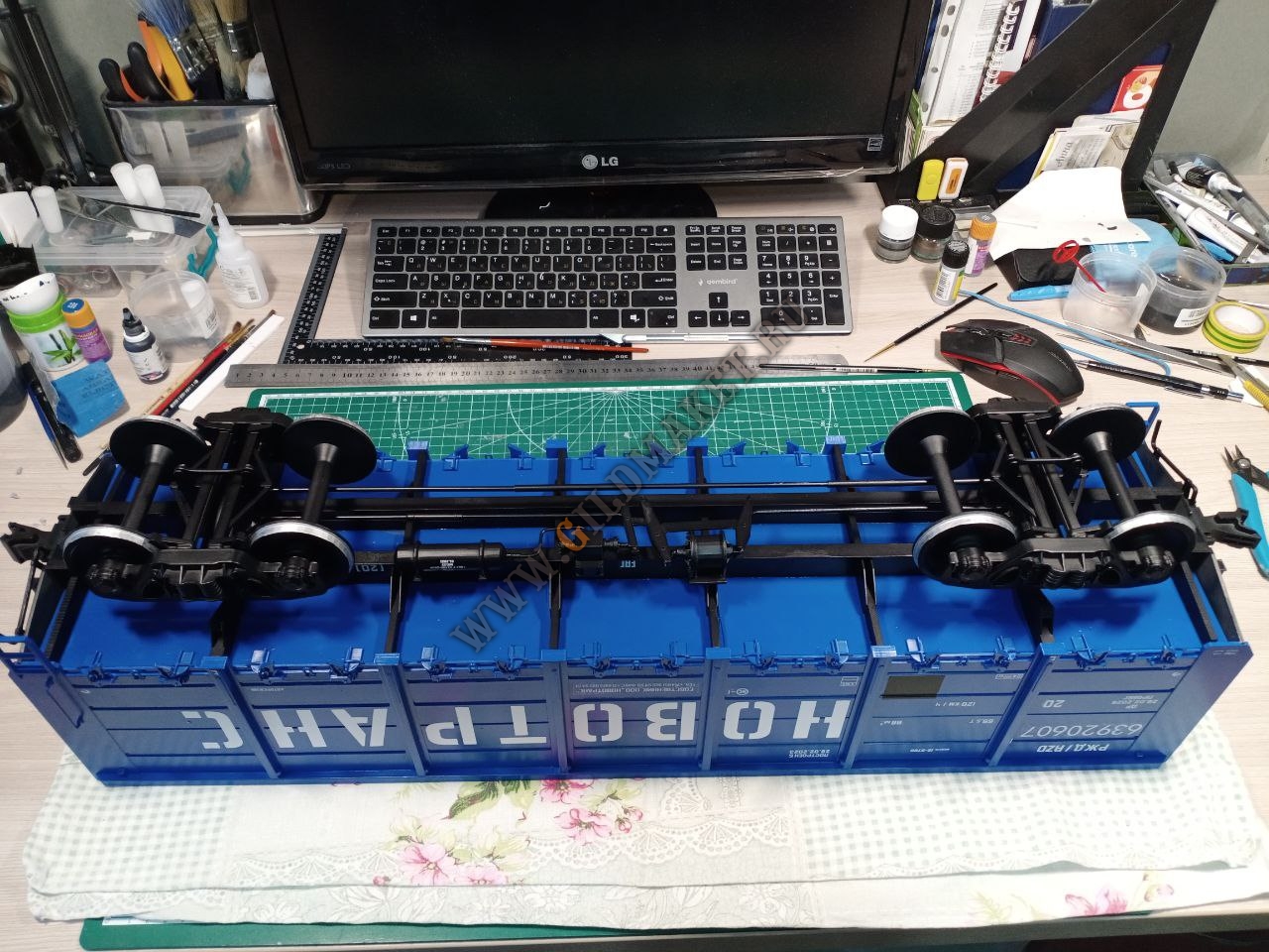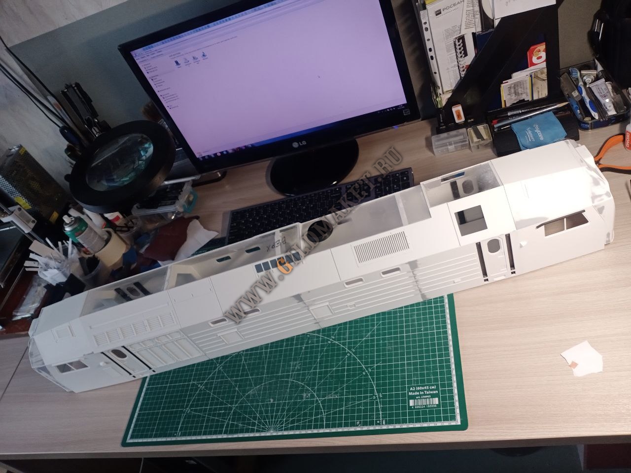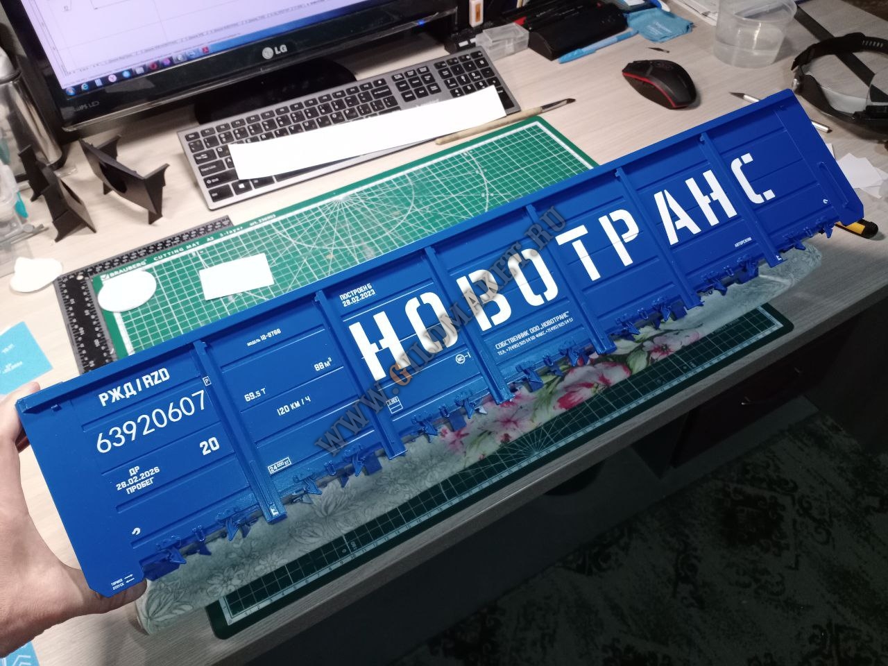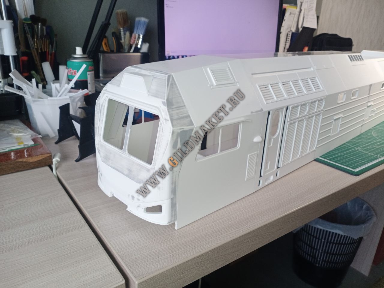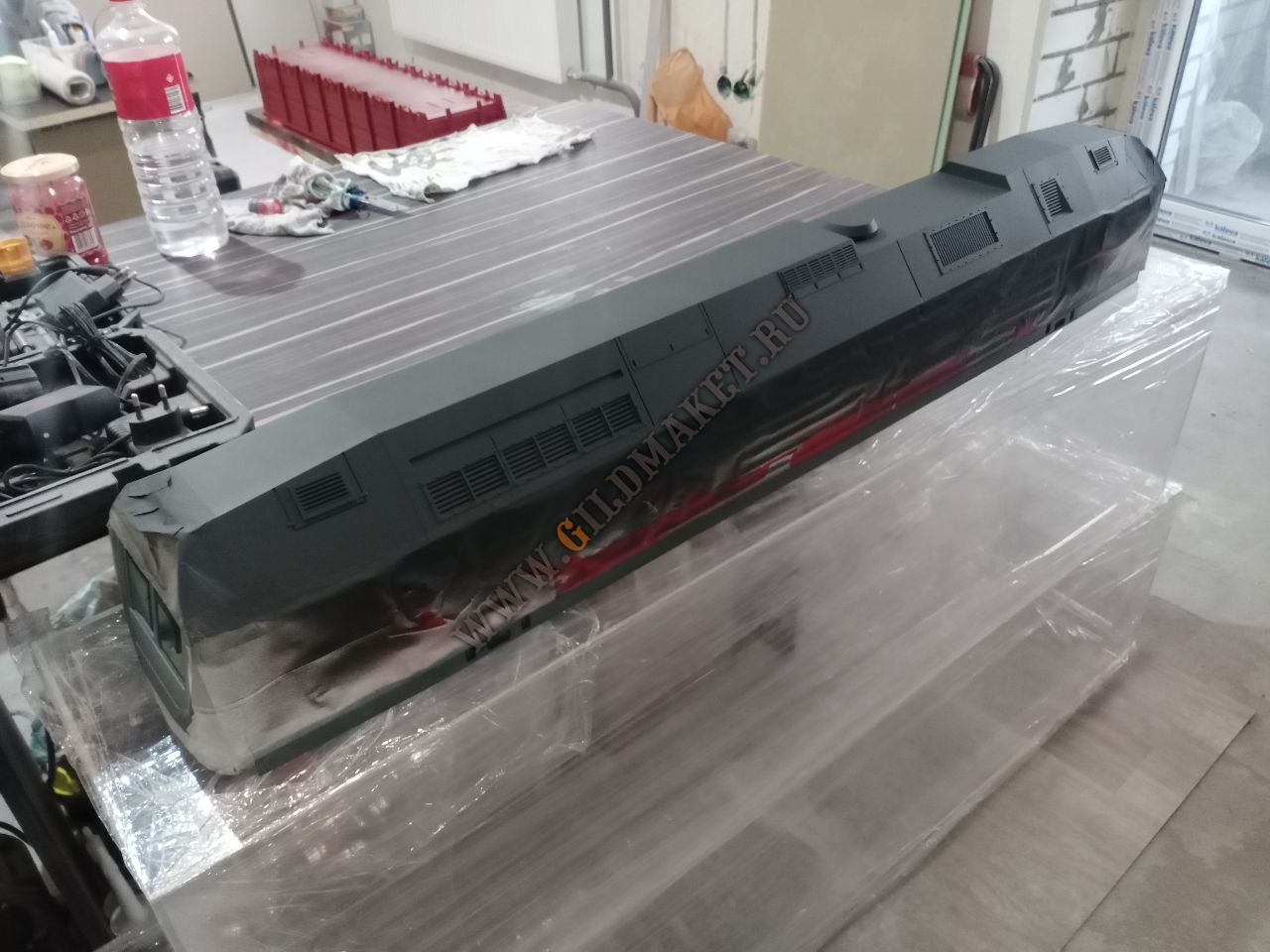 Процесс изготовления: Для реализации проекта была создана подробная 3D-модель на основе чертежей завода-изготовителя. Учитывая большой масштаб, корпус тепловоза и вагонов собирался из сегментов, напечатанных на промышленных принтерах, с последующим армированием. Особое внимание уделили окраске: использованы цвета по системе RAL, полностью соответствующие реальным прототипам РЖД и частных операторов.